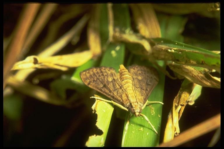 Description: Adult moths are brown moths with wing spans of about 3/4 inch. Wings are held flat over the back when at rest, giving the insect a triangular appearance. Caterpillars grow to almost 3/4 inch long, appearing translucent green with small dark-colored spots or plates arranged on each body segment and a dark, yellowish-brown head capsule. Several other species of sod webworms occur in Metaire Louisiana, mainly from the genus, Crambus. These sod webworms can be distinguished in the adult stage by the way the moths roll their wings around their bodies when at rest rather than holding them out. Larvae are distinguished by the different patterns of plates (panicula) on their thoracic segments. Other common plant-feeding pyralid moths include the genista caterpillar, Uresiphita reversalis (Guenee) (See also the fall webworm) and the lesser canna leafroller, Geshna cannalis (Quaintanaca)